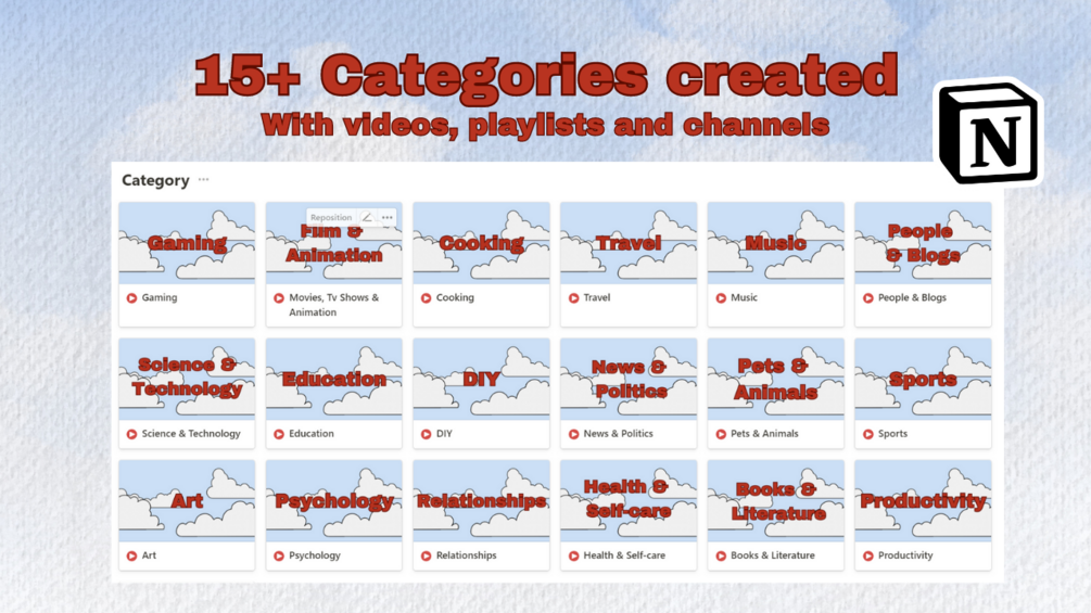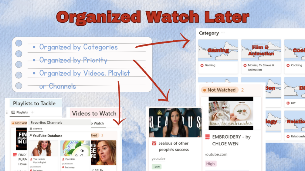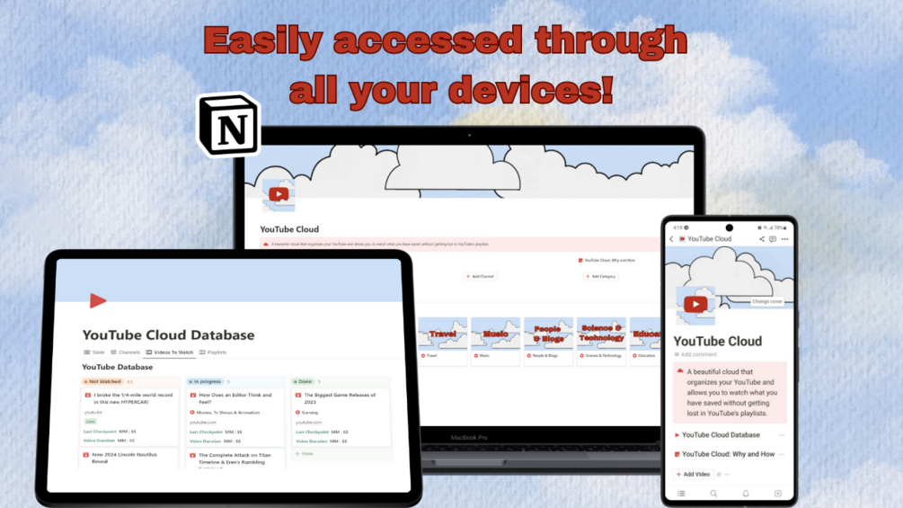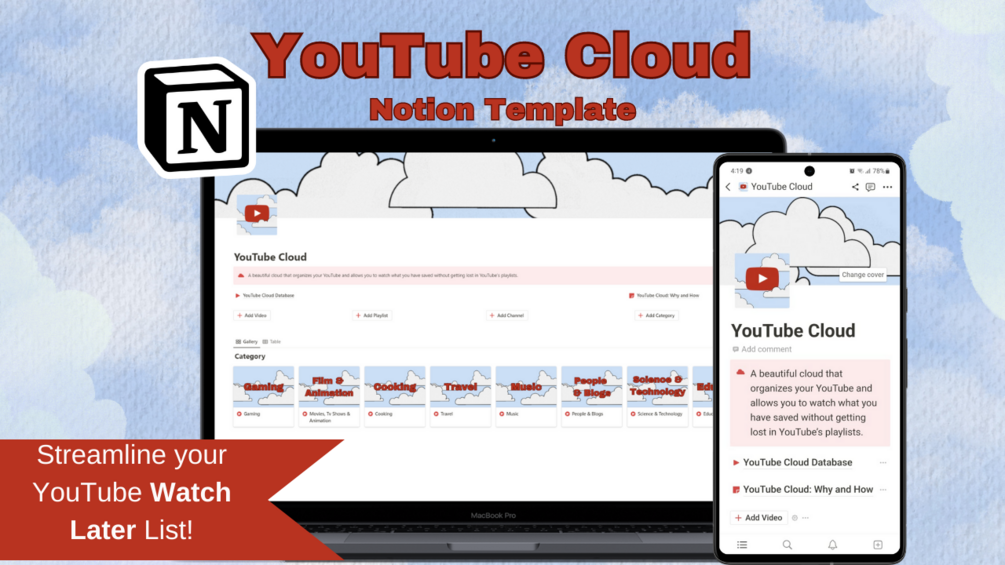YouTube Cloud is a powerful Notion template designed to revolutionize your YouTube viewing experience. It provides a practical and organized approach to managing your video consumption, allowing you to stay focused, save time, and make the most of your YouTube journey.