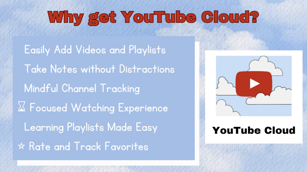 YouTube Cloud is your go-to solution for practical, organized, and mindful YouTube viewing. Whether you're a busy professional, a dedicated student, or someone seeking a mindful approach to content consumption, YouTube Cloud is designed to meet your needs. ✨